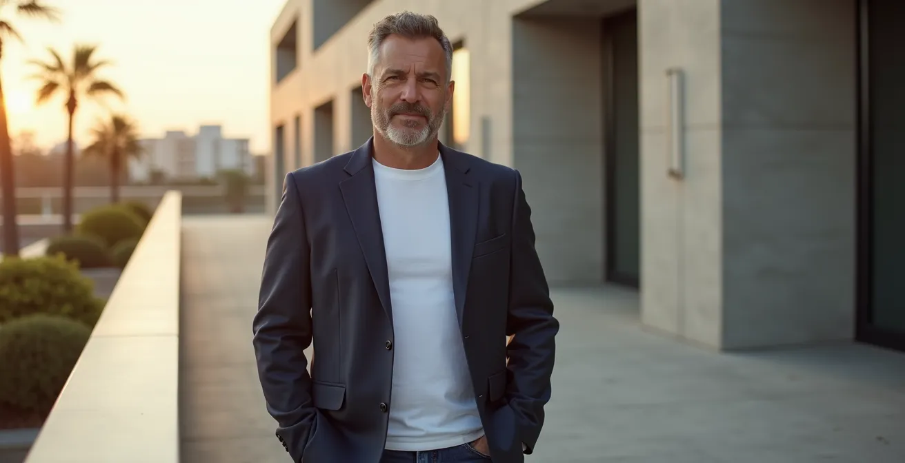 Te plantas frente al espejo. Americana, vaqueros. Una combinación que debería ser la quintaesencia del estilo smart casual. Sin embargo, una duda te asalta, esa molesta voz que susurra: ¿resulta moderno y sofisticado, o estoy cayendo en el temido territorio del «padre enrollado»? Es el dilema de todo hombre de más de 40 años: cómo navegar la fina línea entre la juventud relevante y la madurez respetable, sin parecer que te esfuerzas demasiado por lo primero o que te has rendido a lo segundo. Es un código no escrito, y el miedo al paso en falso es real.